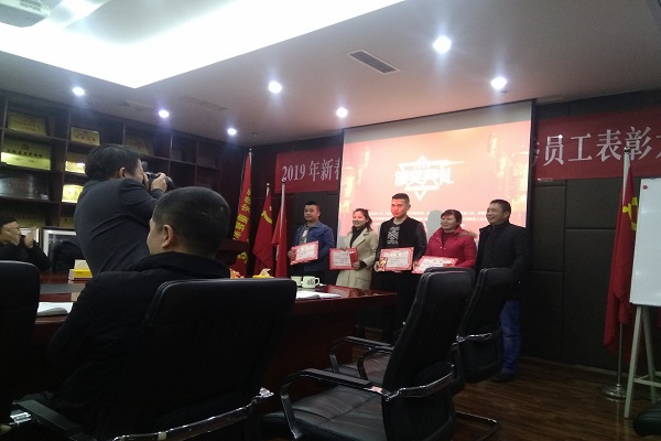 2019年1月31日,,, ,,,2018年度优异员工表扬大会在集团公司聚会室召开,,, ,,,经由对员工综合测评,,, ,,,由部分认真人选举推荐,,, ,,,治理班子研究,,, ,,,报董事会批准:陈莉娟、罗黄琴、孔钰欣、刘强、刘宇、李芸、叶小双等共十一位同志被评为“2018年度优异员工”;;;;;;;牛栋梁、杨启鹏、刘克俊三位同志被评为“2018年度优异治理者”,,, ,,,集团公司董事长、总裁、常务副总裁对先进员工举行了颁奖。。。。。。。。
